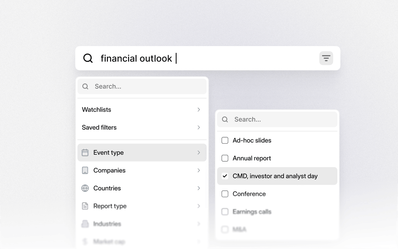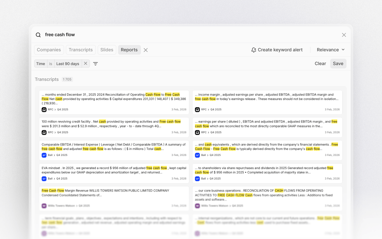 Narrow results using filters such as company, watchlist, industry, date range, and filing type. Start broad across the full market, then focus on a specific peer set or reporting window.Filters can be combined to match your exact research scope. For example: outlook mentions from U.S. software companies over the past four quarters, or credit and liquidity language from European industrials during the last two earnings seasons.
