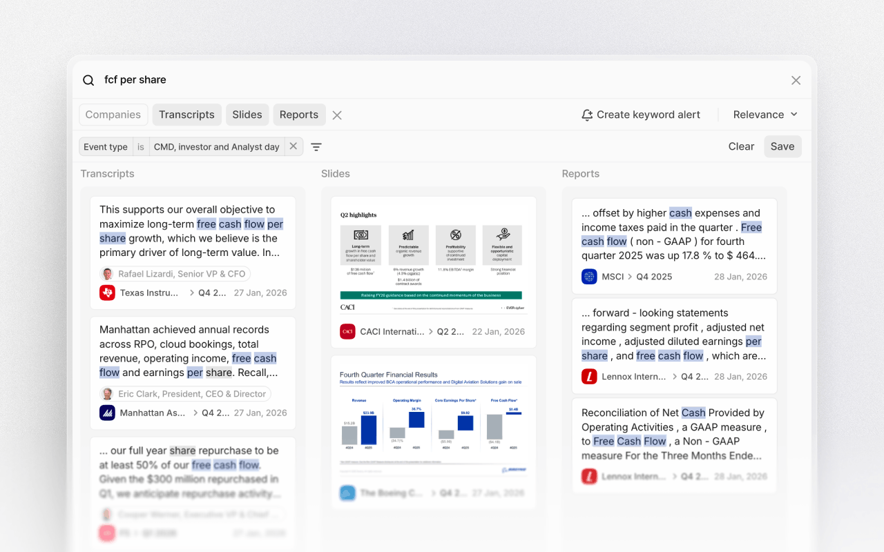 Global search lets you search for any keyword across all investor relations documents at once: earnings call and event transcripts, filings, and slide presentations. Every search scans the full database of 40M+ first-party documents.You can also narrow your scope with customer filters such as document type, event type, time series, market cap, industries, and more.