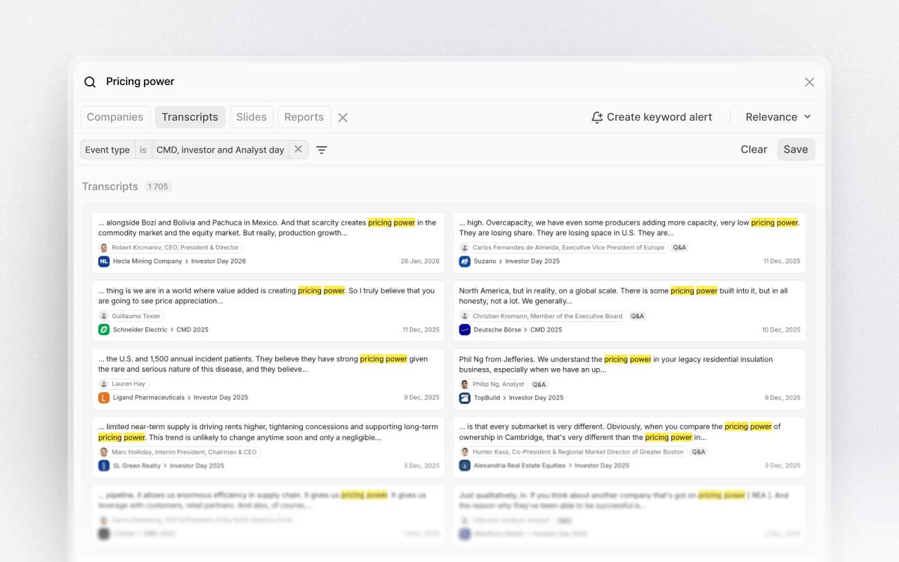 Transcript search lets you search across every spoken word from public company events. Instantly find where a topic was mentioned, who said it, and in what context – across earnings calls, capital markets days, investor conferences, and more.Every result is sourced from first-party transcripts and fully time-aligned with the original audio, so you can move seamlessly between text and voice.